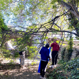 However, natural trash was just the tip of the iceberg for unusual finds in our creek cleanup project. We also found a sliding door frame, metal fencing, and a couple wooden platforms, possibly pieces from a home renovation nearby, which were so big that they even ripped our trash bags! It serves to look up, as well, because we rescued mylar balloons tied up in the tree branches. There was, of course, graffiti on walls within the creek bed walls especially under Grant Rd, Milton Ct and Drericx Dr.